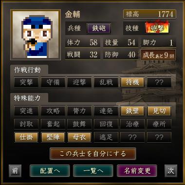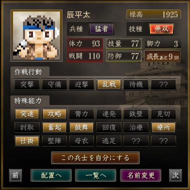 名前 兵種 技種 禄高 体力 技量 戦闘 防御 脚力 成長 作戦行動 特殊能力