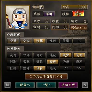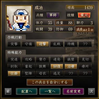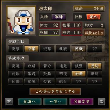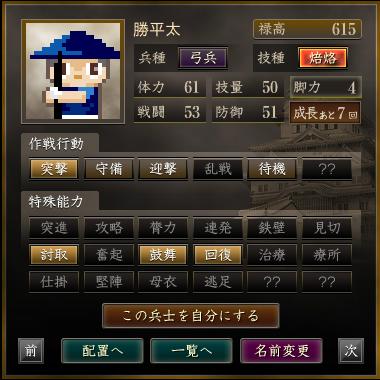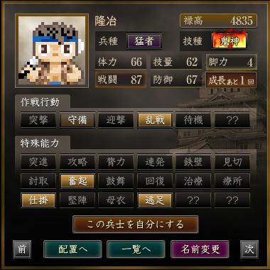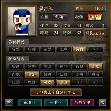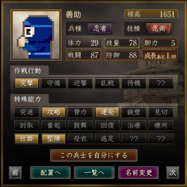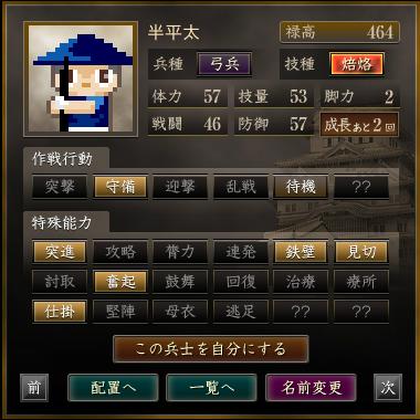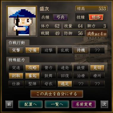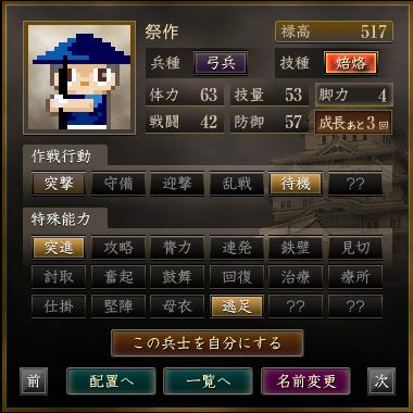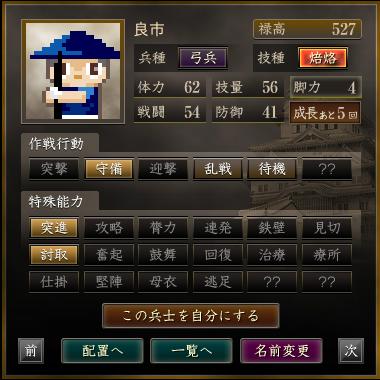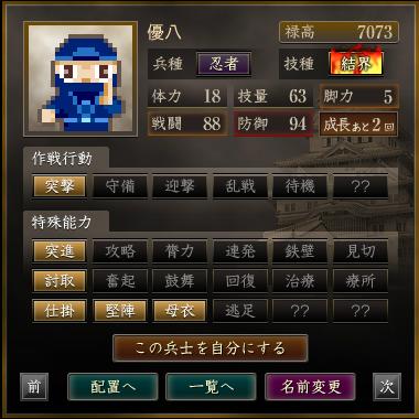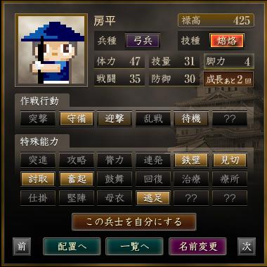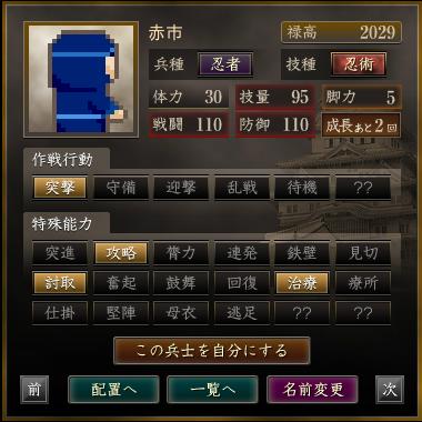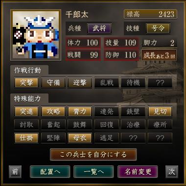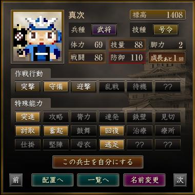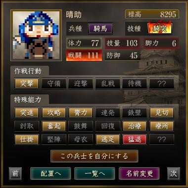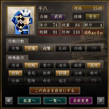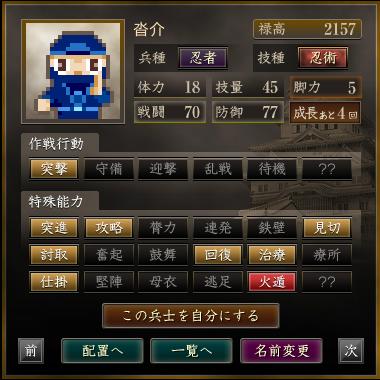 名前 兵種 技種 禄高 体力 技量 戦闘 防御 脚力 成長 作戦行動 特殊能力