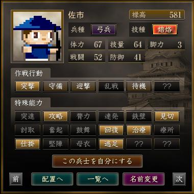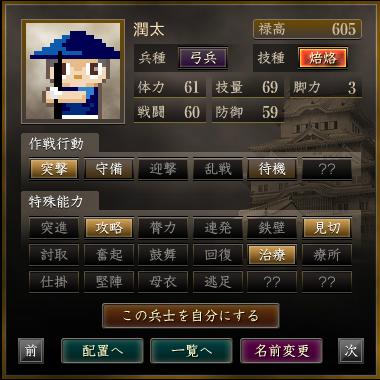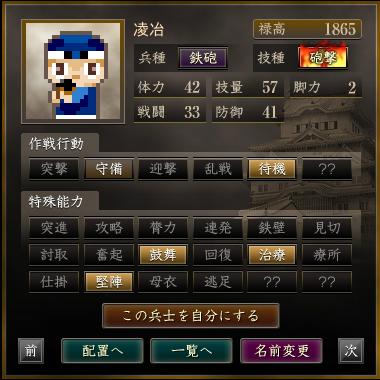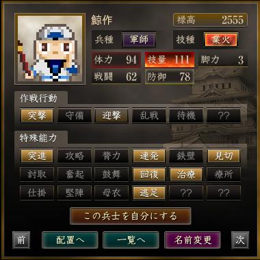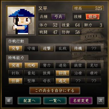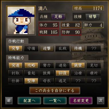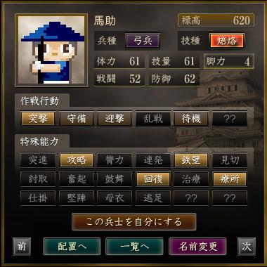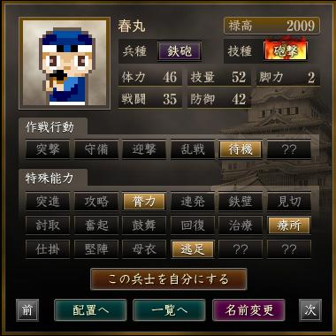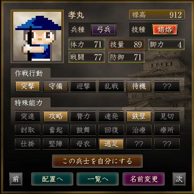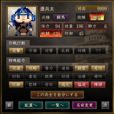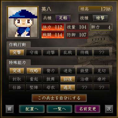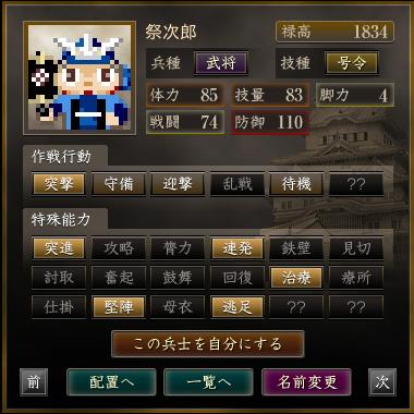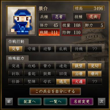 名前 兵種 技種 禄高 体力 技量 戦闘 防御 脚力 成長 作戦行動 特殊能力