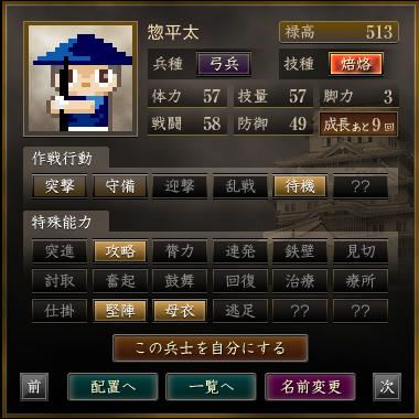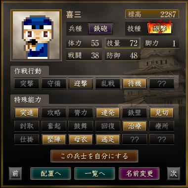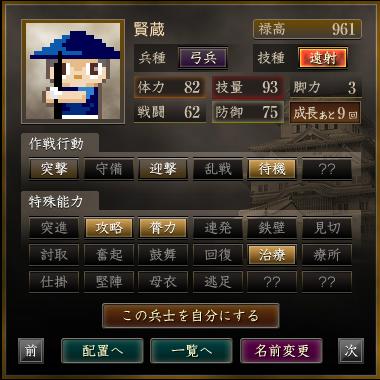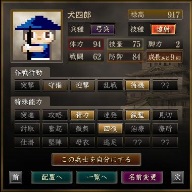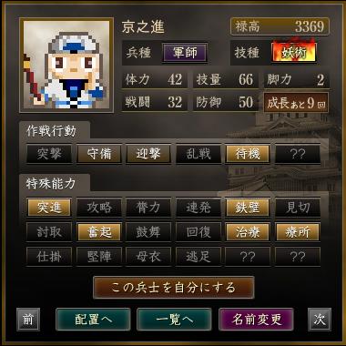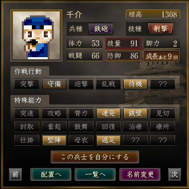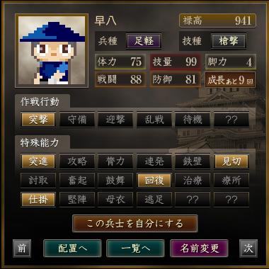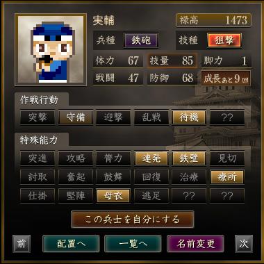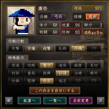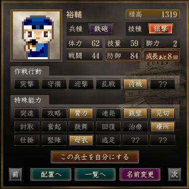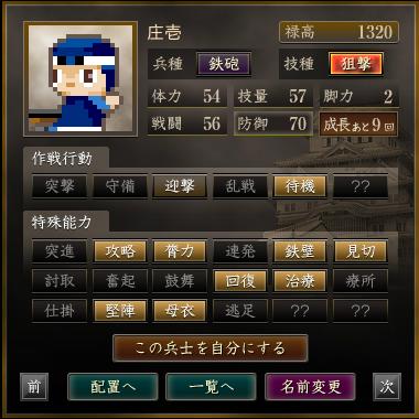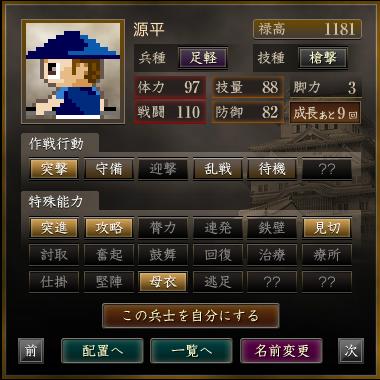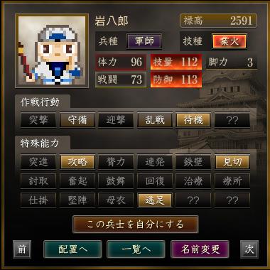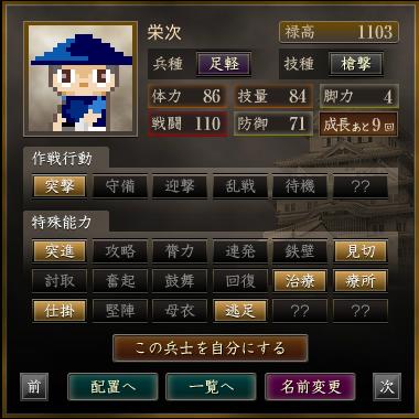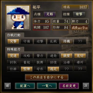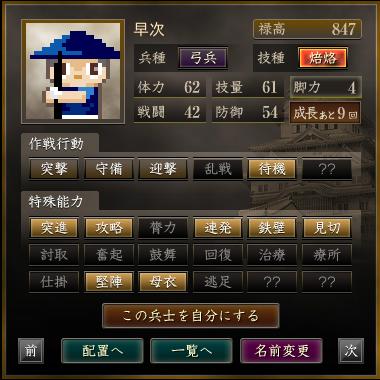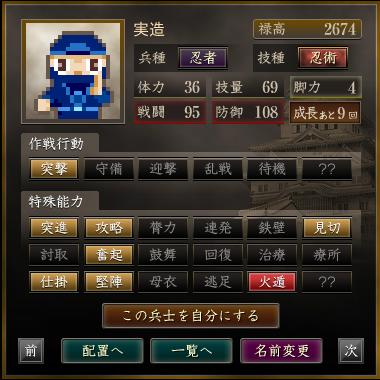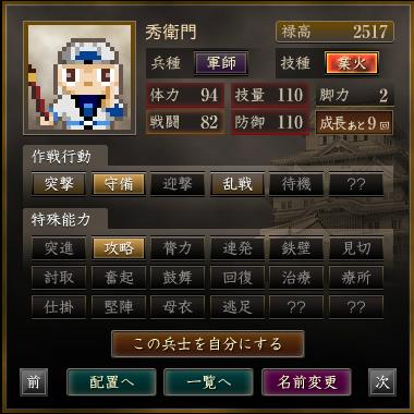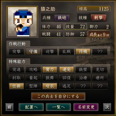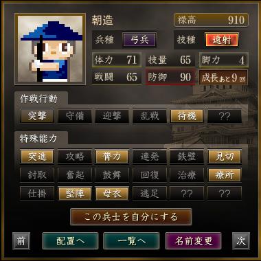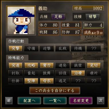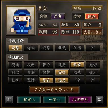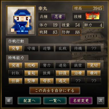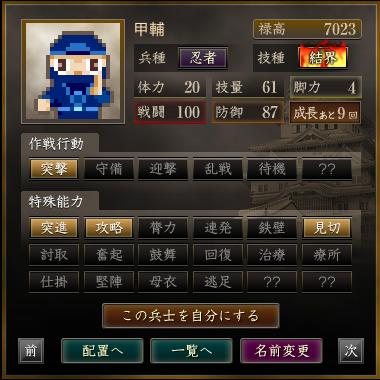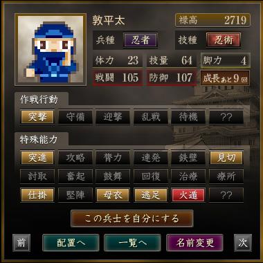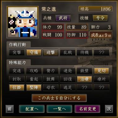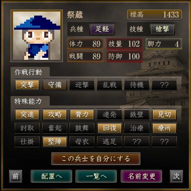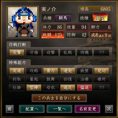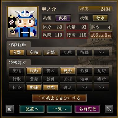 名前 兵種 技種 禄高 体力 技量 戦闘 防御 脚力 成長 作戦行動 特殊能力