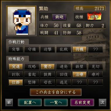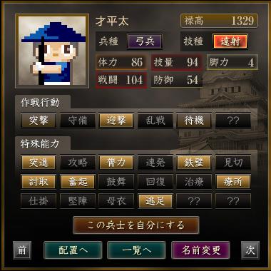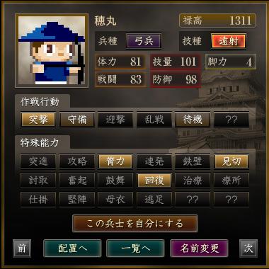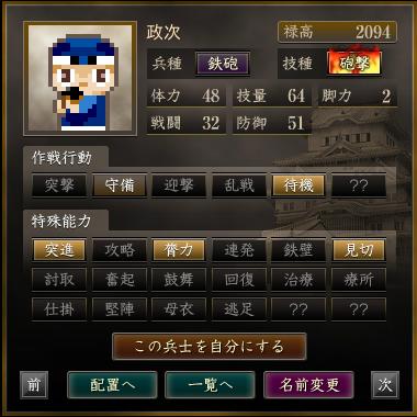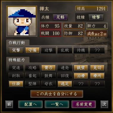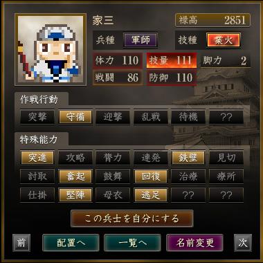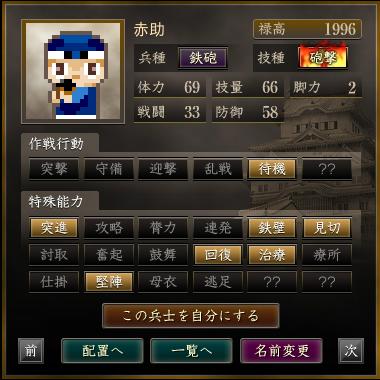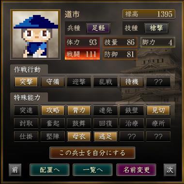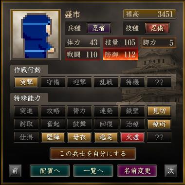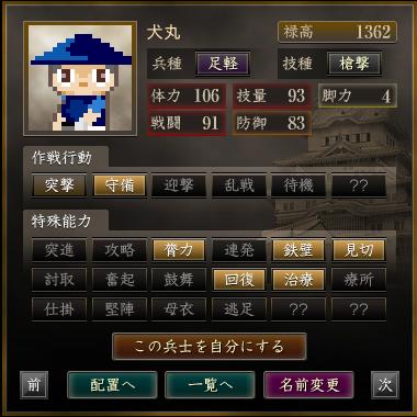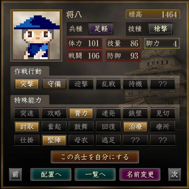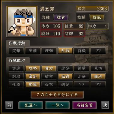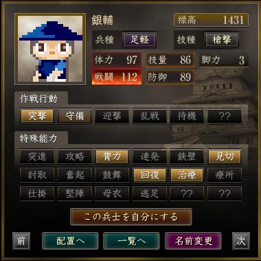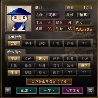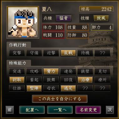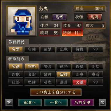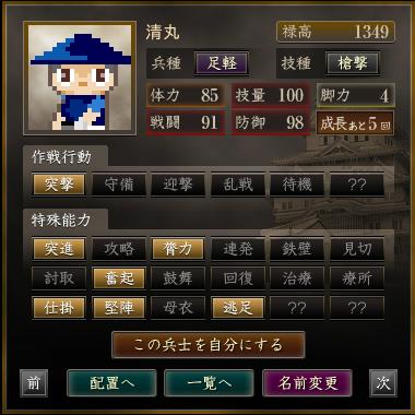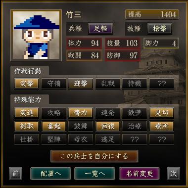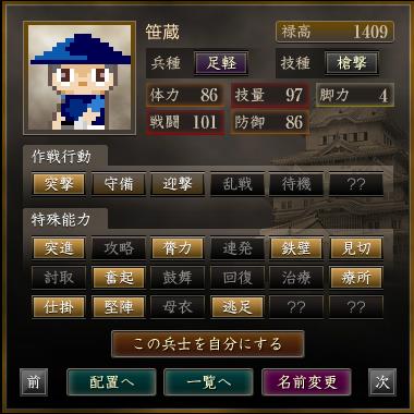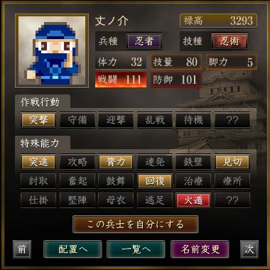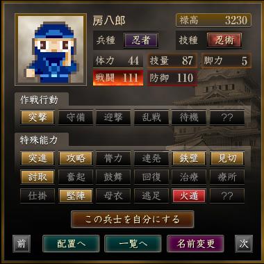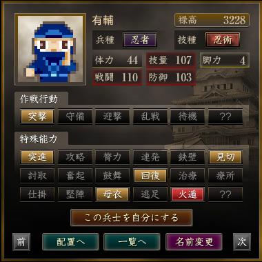 名前 兵種 技種 禄高 体力 技量 戦闘 防御 脚力 成長 作戦行動 特殊能力
