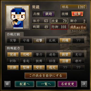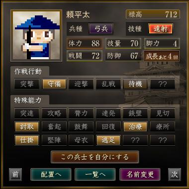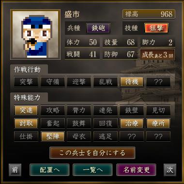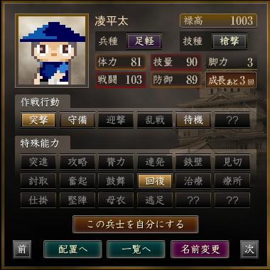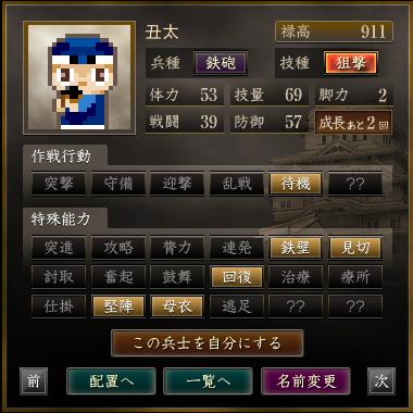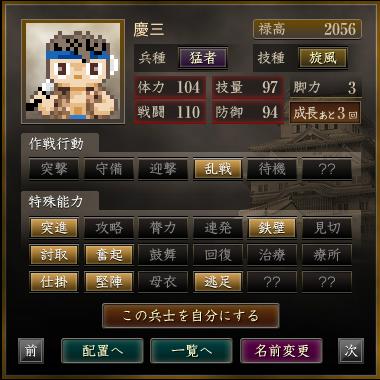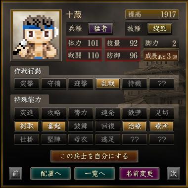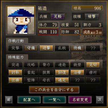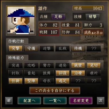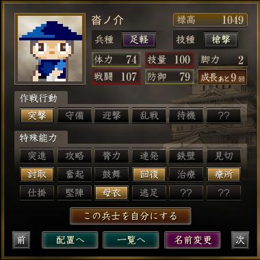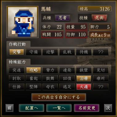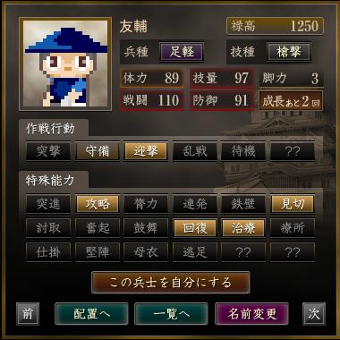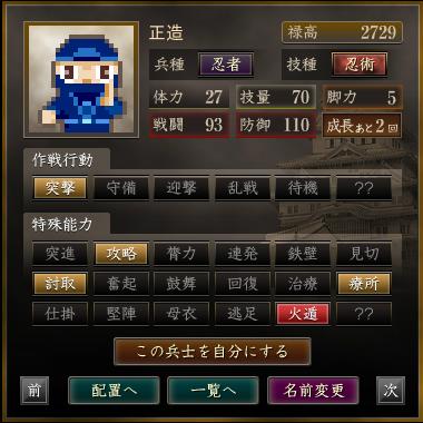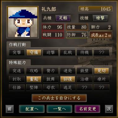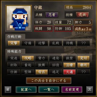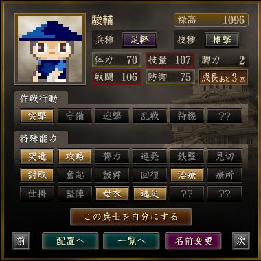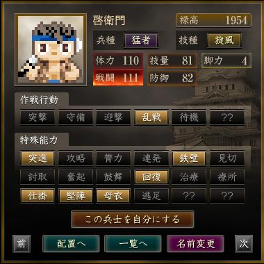 名前 兵種 技種 禄高 体力 技量 戦闘 防御 脚力 成長 作戦行動 特殊能力