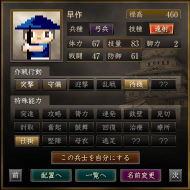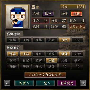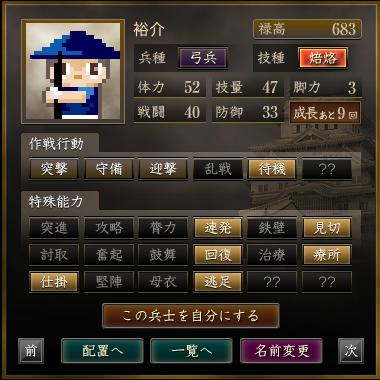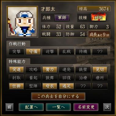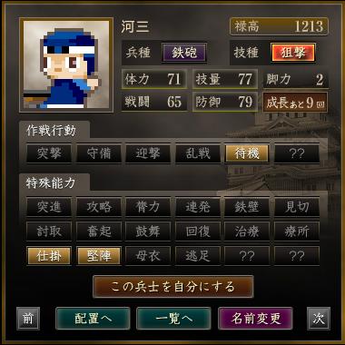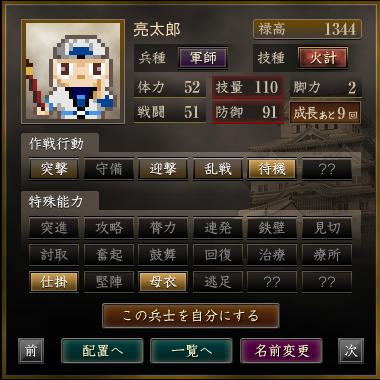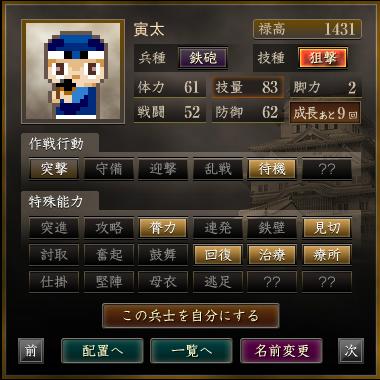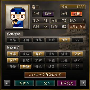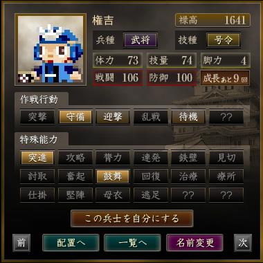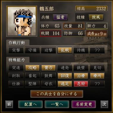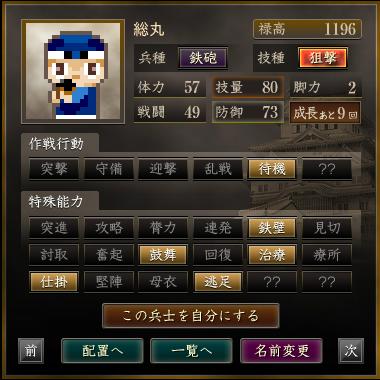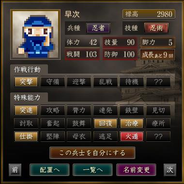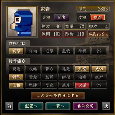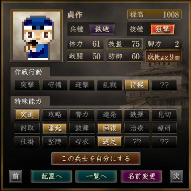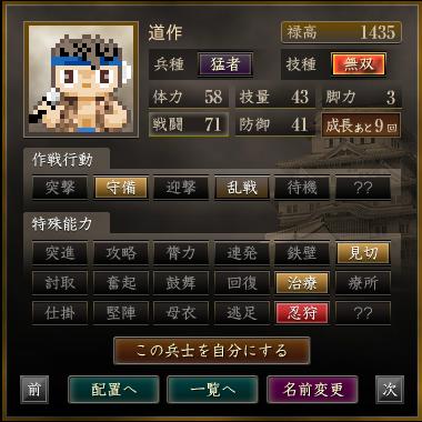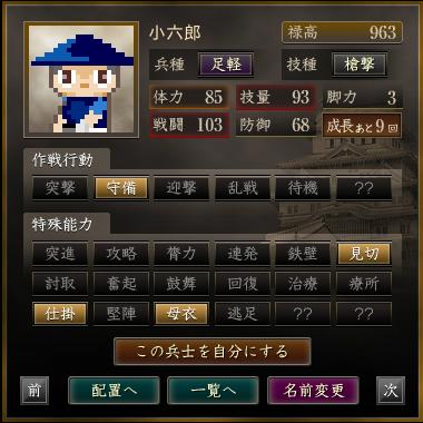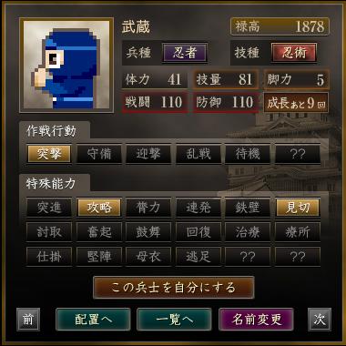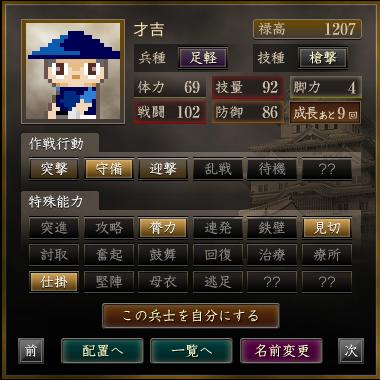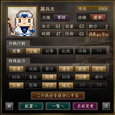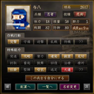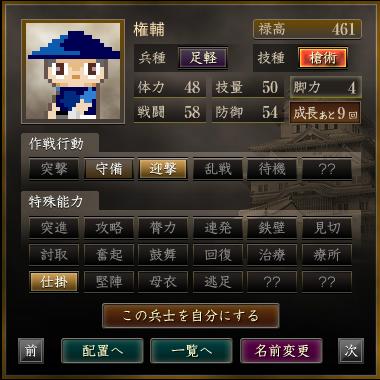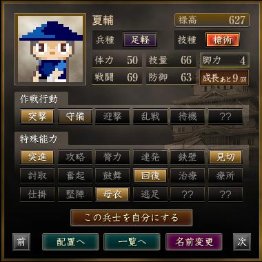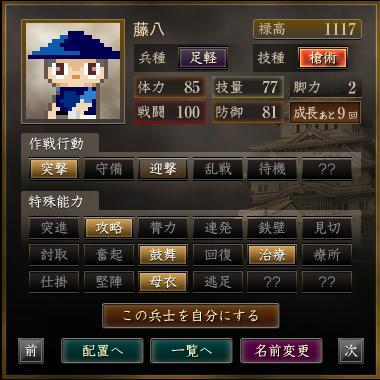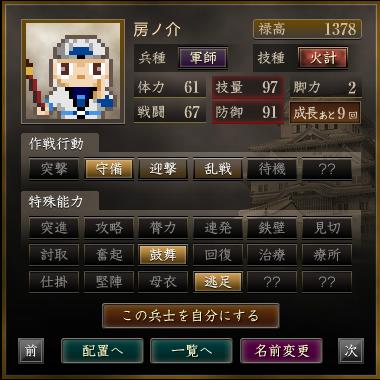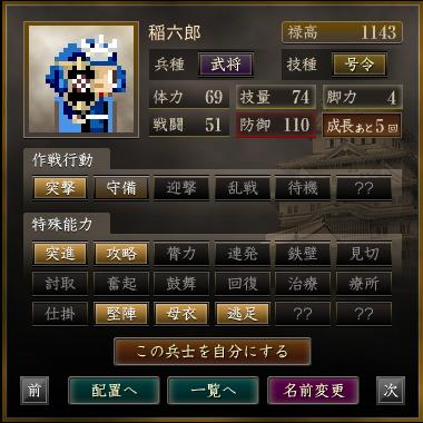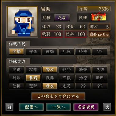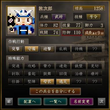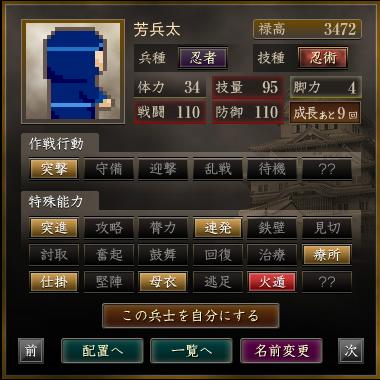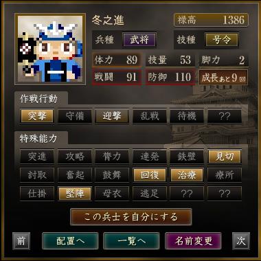 名前 兵種 技種 禄高 体力 技量 戦闘 防御 脚力 成長 作戦行動 特殊能力