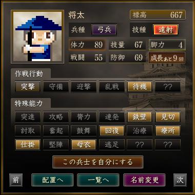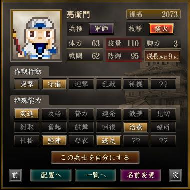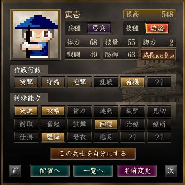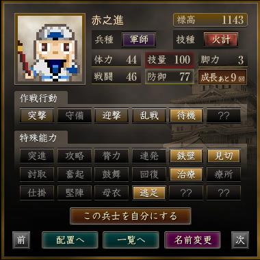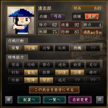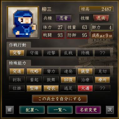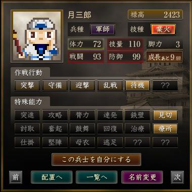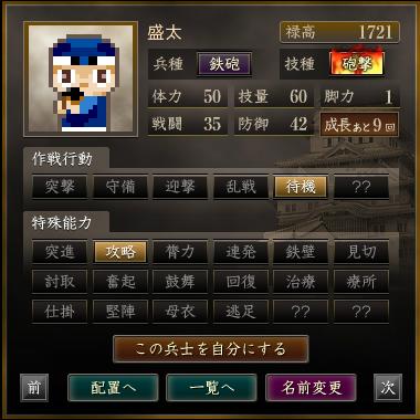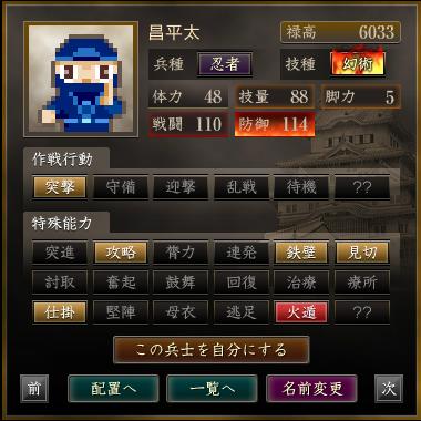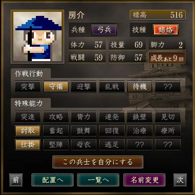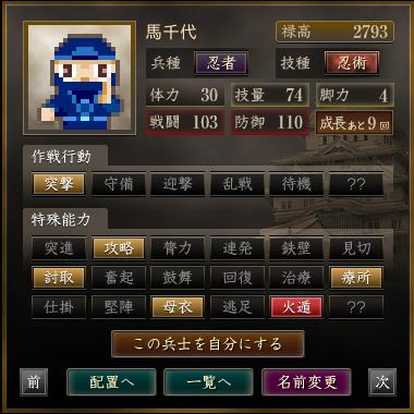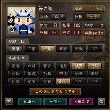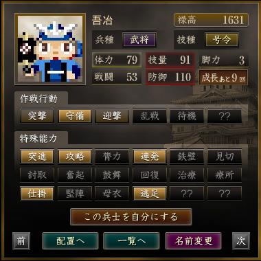名前 兵種 技種 禄高 体力 技量 戦闘 防御 脚力 成長 作戦行動 特殊能力