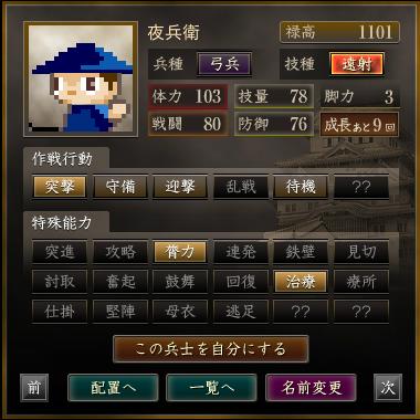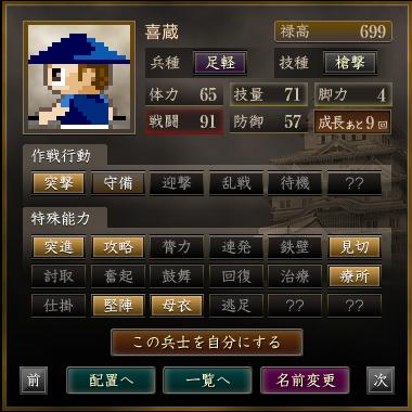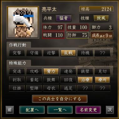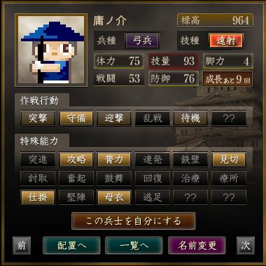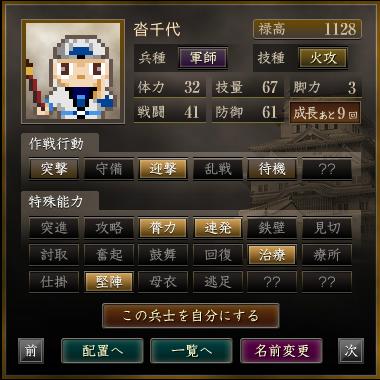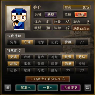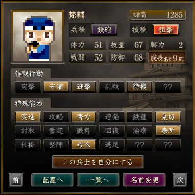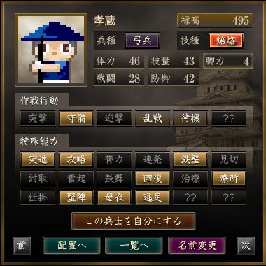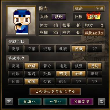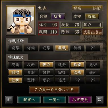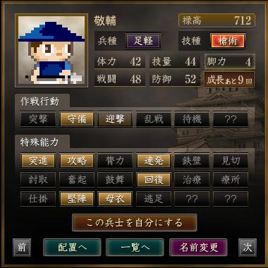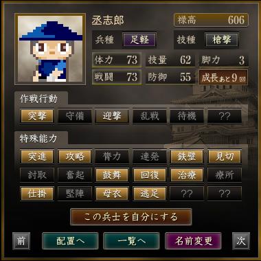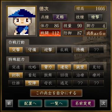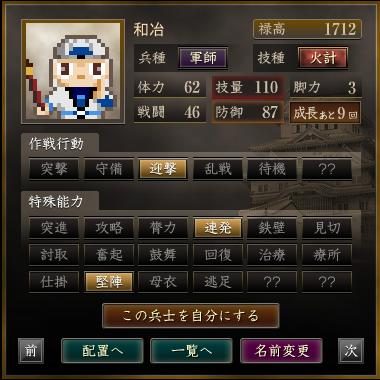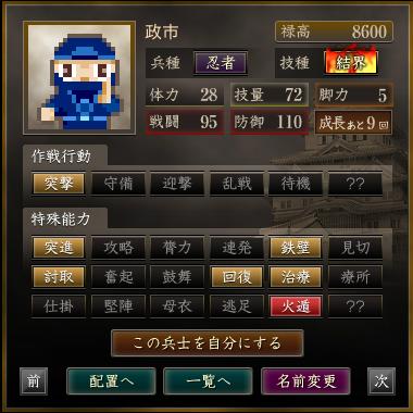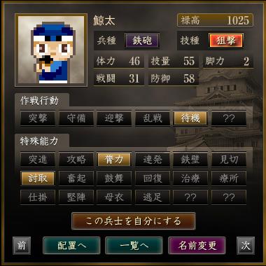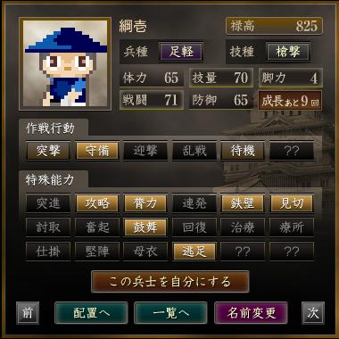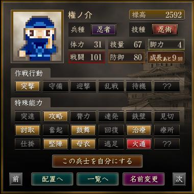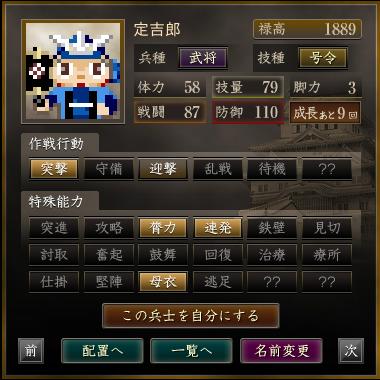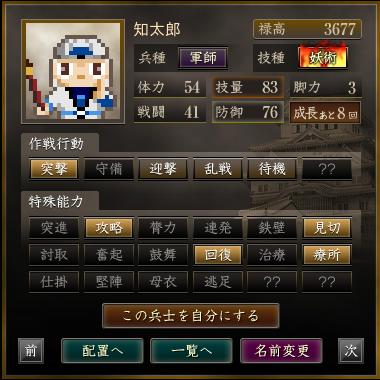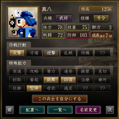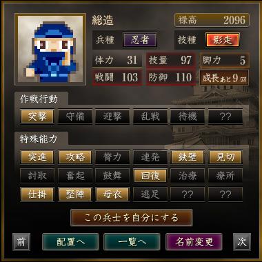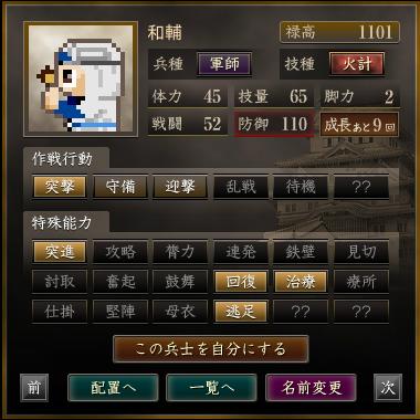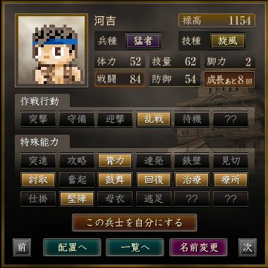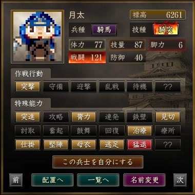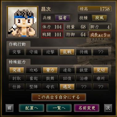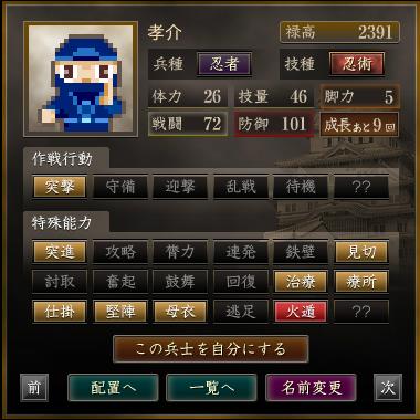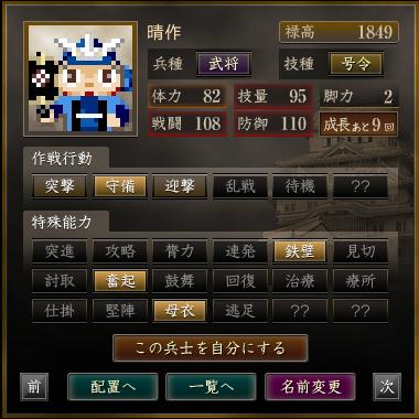 名前 兵種 技種 禄高 体力 技量 戦闘 防御 脚力 成長 作戦行動 特殊能力