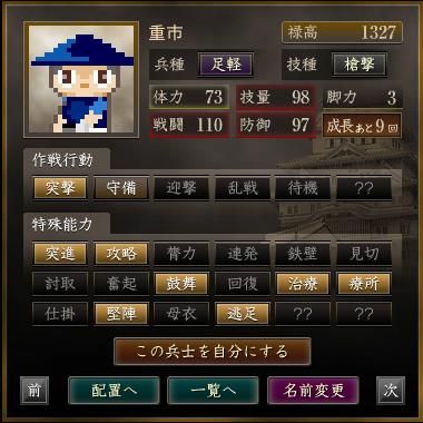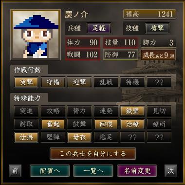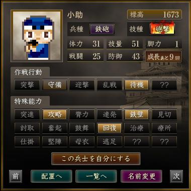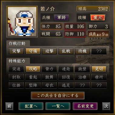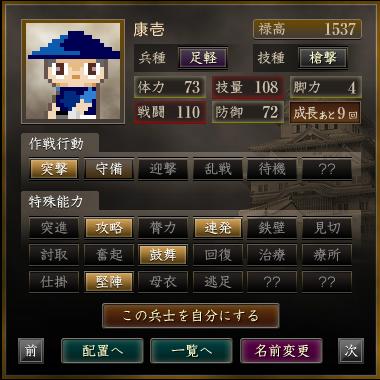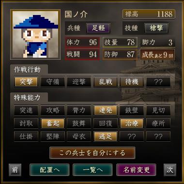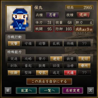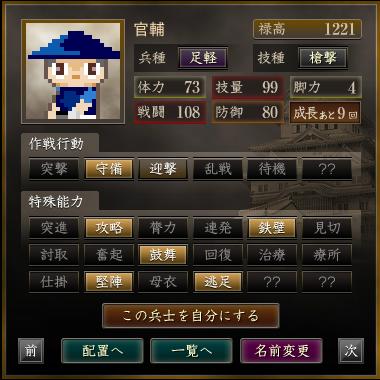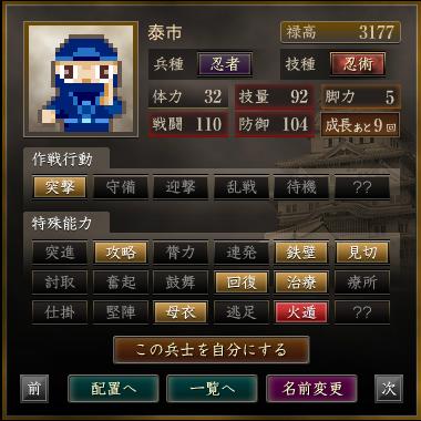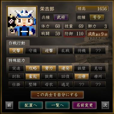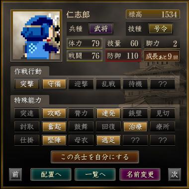 名前 兵種 技種 禄高 体力 技量 戦闘 防御 脚力 成長 作戦行動 特殊能力