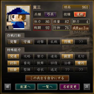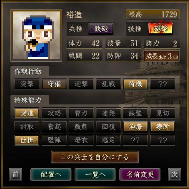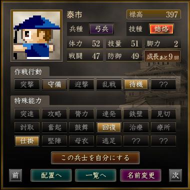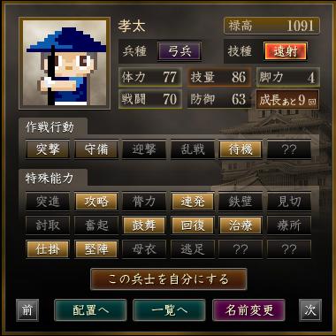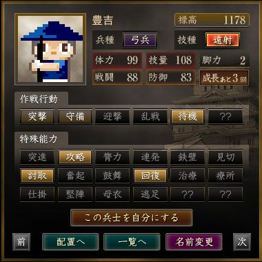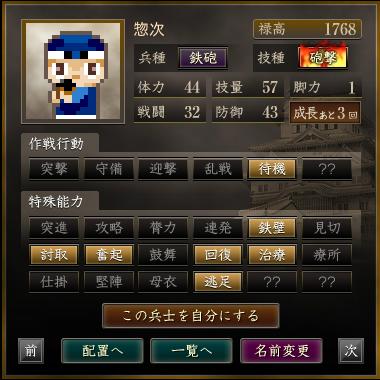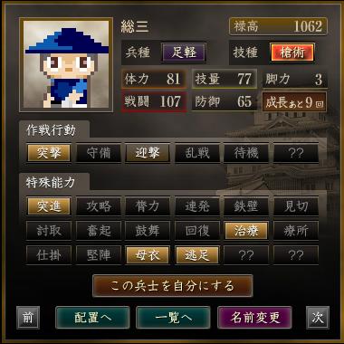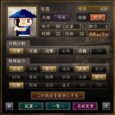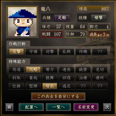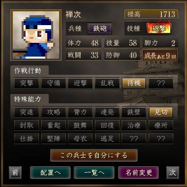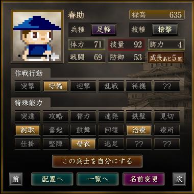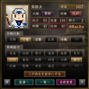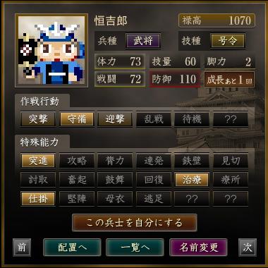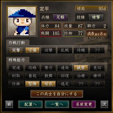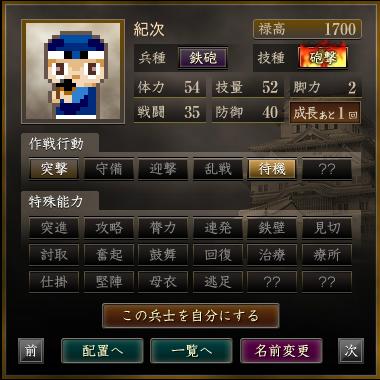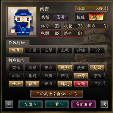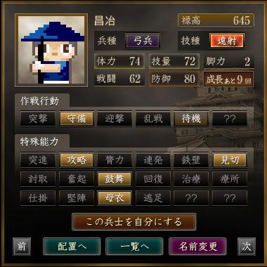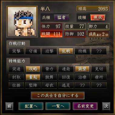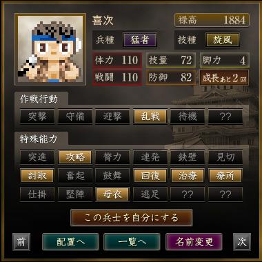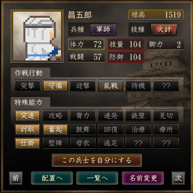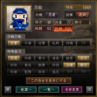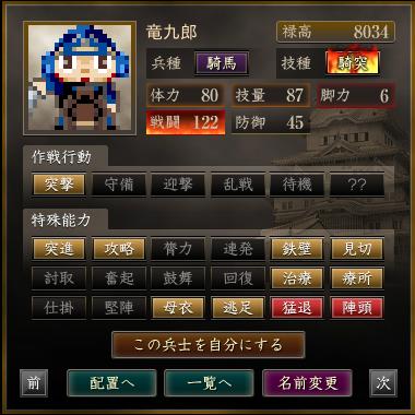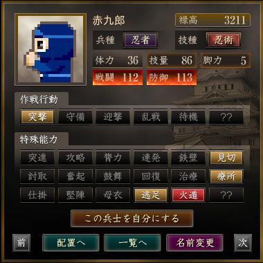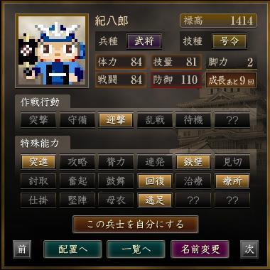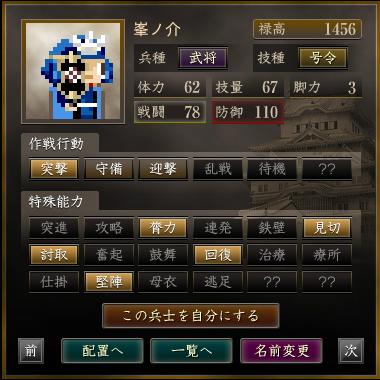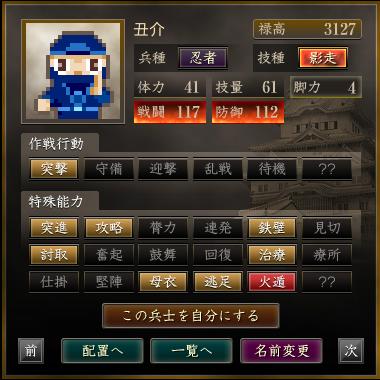 名前 兵種 技種 禄高 体力 技量 戦闘 防御 脚力 成長 作戦行動 特殊能力