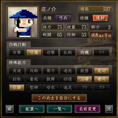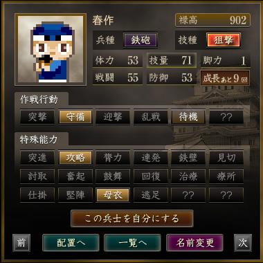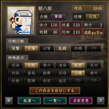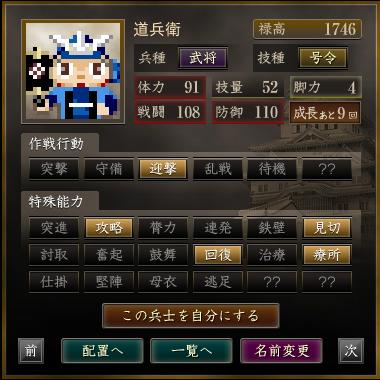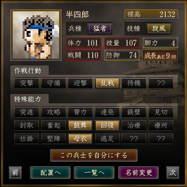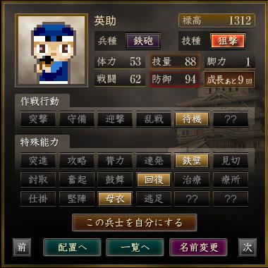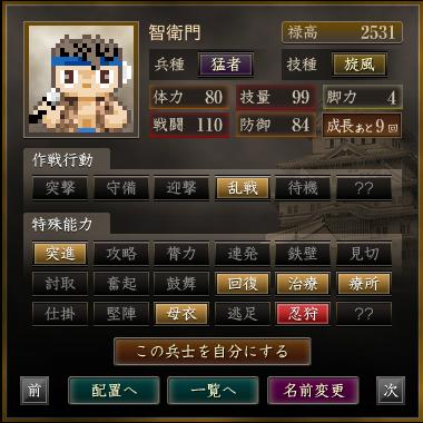 名前 兵種 技種 禄高 体力 技量 戦闘 防御 脚力 成長 作戦行動 特殊能力