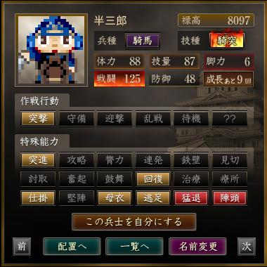 | 軍団名 | 名前 | 兵種 | 技種 | 禄高 | 体力 | 技量 | 戦闘 | 防御 | 脚力 | 成長 | 作戦行動 | 特殊能力 |