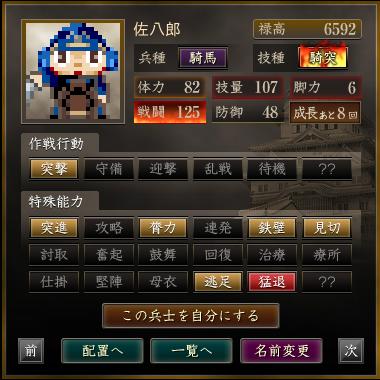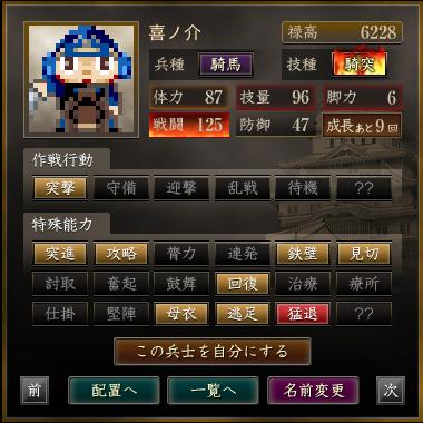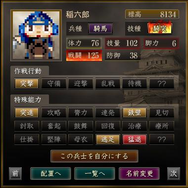 | 軍団名 | 名前 | 兵種 | 技種 | 禄高 | 体力 | 技量 | 戦闘 | 防御 | 脚力 | 成長 | 作戦行動 | 特殊能力 |