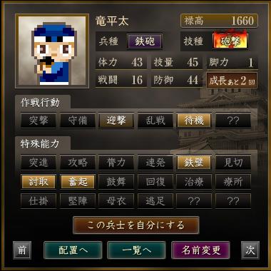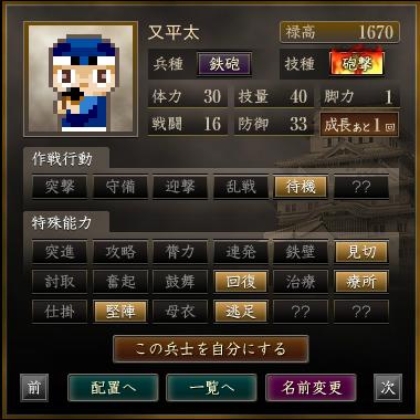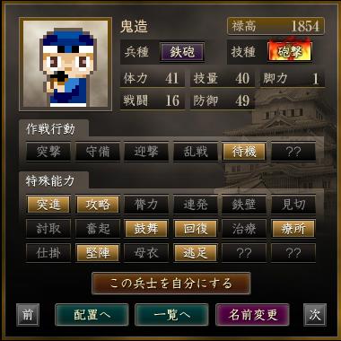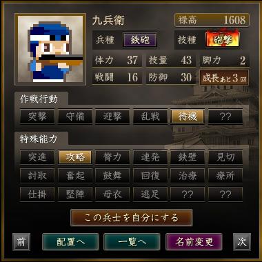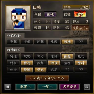 | 軍団名 | 名前 | 兵種 | 技種 | 禄高 | 体力 | 技量 | 戦闘 | 防御 | 脚力 | 成長 | 作戦行動 | 特殊能力 |