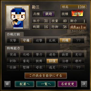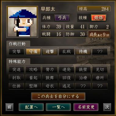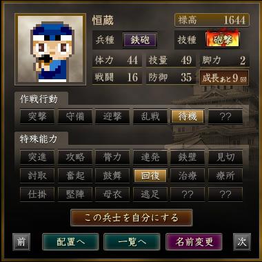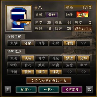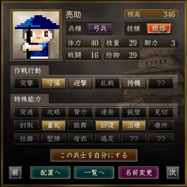| 軍団名 | 名前 | 兵種 | 技種 | 禄高 | 体力 | 技量 | 戦闘 | 防御 | 脚力 | 成長 | 作戦行動 | 特殊能力 |